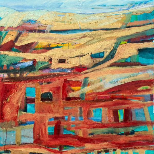 Known for her expansive abstract landscapes imbued with quilt-like textural lushness, Allison Collins' paintings are untethered to any exact places. Imparting the emotion of encountering or traveling through open spaces, fields, sky, and vast expanses, the paintings are woven with deeply saturated hues of red, gold, and deep greens and blues. Collins vacillates between a far-off horizon and shorten depth of field. At times, she flattens her geometric forms and planes of color, but we are still given a horizon.