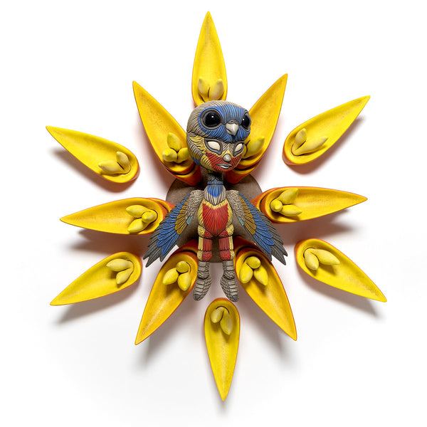 Calvin Ma’s sculptures are imbued with a sense of childlike exploration and storytelling. His newest body of work beautifully depicts a recognizable figure we see throughout his sculptures, this time as birds in a variety of postures, each with a hybrid human-bird face. His characteristically stunning highly detailed work here showcases his skill through the bright feathers and rich surface details of each form. Some pieces appear to hover or balance, others pause in stillness for a moment. Ma masterfully imparts character and personality into his artworks.