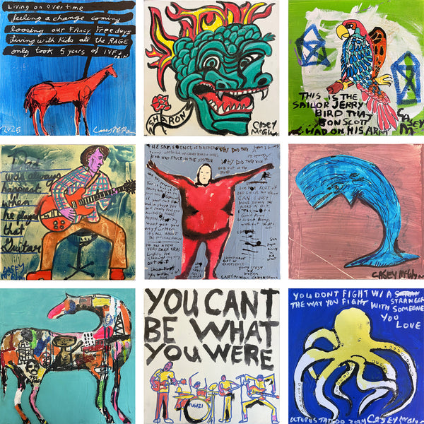 Casey McGlynn first began exploring his creativity as a child, drawing for hours and developing his robust visual language. McGlynn’s paintings, often including collaged elements, are honest, vulnerable, and dynamic. He depicts himself and those close to him, through symbols like whales, birds, elephants, horses, and a large man in red. Angst is balanced by humor, and canvases include written words that read as diary entries. Inspired by the early punk rock scene in Toronto, ON, and a musician himself, McGlynn's connection to punk’s rejection of the mainstream is evident. But McGlynn’s rebellion is approachable, posed as a question that he continues to explore in his sensitive work.