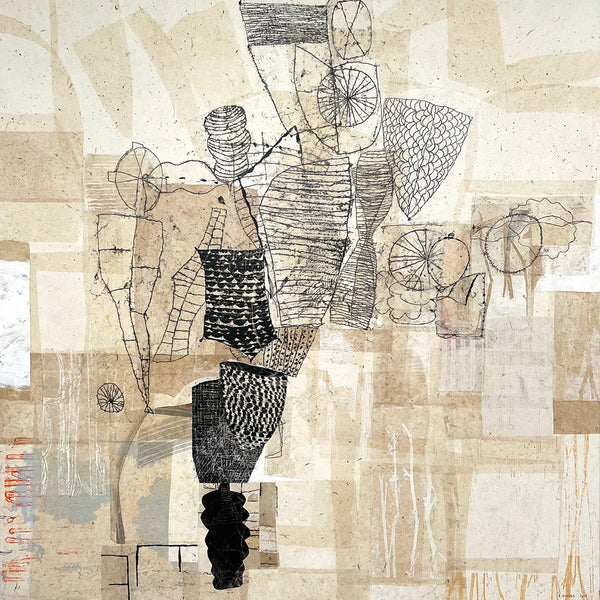 Eva Isaksen works in a variety of media, most frequently collage, acrylic inks, graphite, and monotypes. Recent explorations have pushed the collage style she is most known for into a more graphic, abstracted realm, using a range of soft neutrals and warm blacks, as well as controlled hints of highly saturated colors. She has also recently used source materials from her native Norway - vintage clippings from publications and texts. Everything Isaksen does is woven with her recognizable sensibility, while she continues to explore new realities within her work.