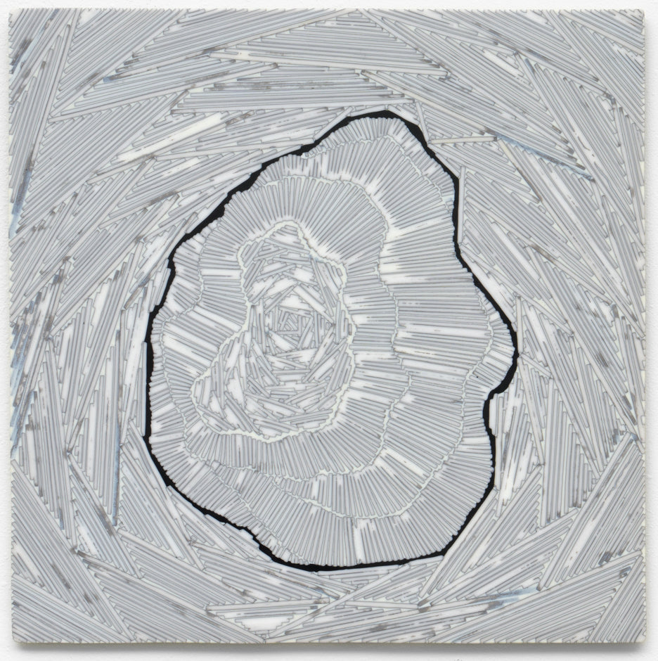 Open-Cut explores altered landscapes from extraction processes and is inspired by open-cut mines carving into the landscape. The color in the mosaic is created by a chemical reaction at high temperature in the kiln between two white glass bodies, referencing the use of extracted minerals in our daily lives. - Katie Miller