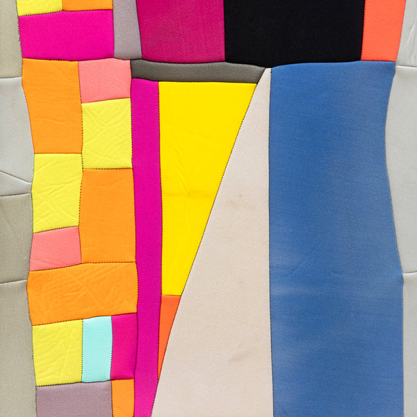 Henry Jock Walker's wide-ranging practice explores possibilities of performance, especially surfing, in tandem with painting and collage through collaboration and socially inclusive events and spectacles. Walker's instincts for breaking up space with line and shapes are somewhat classical despite the use of neoprene in a series of two-dimensional collages, which he sources from fragments of repurposed wetsuits to bring a unique texture and contemporary edge to the work. The stitched seams create soft grooves which behave as graphic elements between brightly colored patches of fabric. Often playful and with unexpected titles, the assorted mix of salvaged neoprene offers varying levels of reflection and light absorption which allows the work to take on a more serious tone at times.