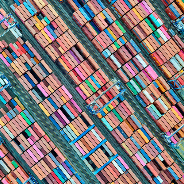 Aerial images by Jeffrey Milsteins Newark Port 10 reveal a bustling shipping yard, with colorful containers arranged in precise, vibrant geometric patterns. High-resolution cameras capture the vivid hues of orange, pink, blue, and green containers in perfect alignment.