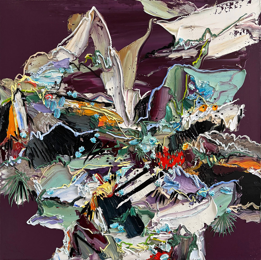 Nicole Katsuras' oil on canvas abstractions are characterized by her distinct gestural mark-making, bold colors and impasto surfaces. Radiant thin and thick oil paints are pushed, pulled, and extruded on canvas to compose lively, elegant, and playful abstracted scenes. There is no single narrative that underpins her work—the gestural nature of Abstract Expressionism, Ukiyo-e, as well as CoBrA and Impressionism have all influenced her painting.