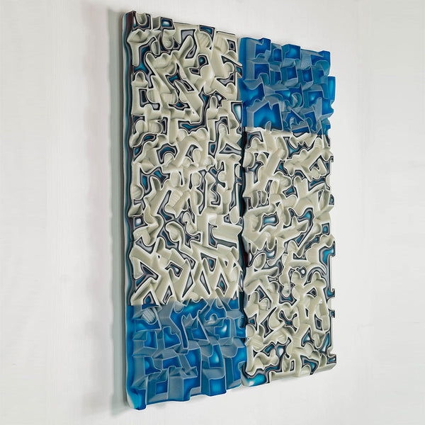 Multiple sheets of Bullseye glass were then fired together to form a solid block. This block was placed over the plaster mold and kiln-fired again, allowing the glass to soften and flow into the detailed surface of the mold. Once cooled, the plaster was carefully removed and the glass was cleaned to reveal the formed structure.