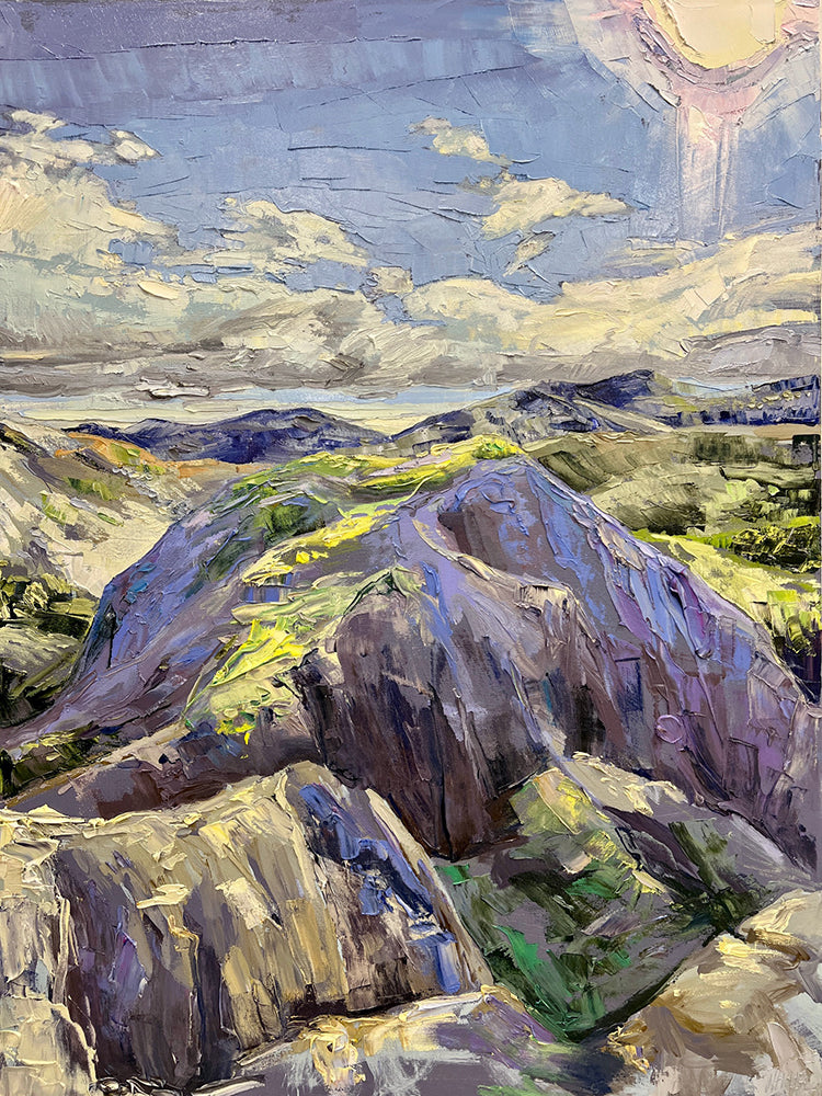 Using both real and imagined places for her inspiration, Julie Himel creates pathways and landscapes that invite the viewer to step into her dreamlike environments. She creates richly textured surfaces by using bold, active brushstrokes and unorthodox, yet highly saturated colors. Using paint as the medium to formalize the possibility of a place, Himel’s Awe Struck series reflects a call for symbiosis with the natural world around us.