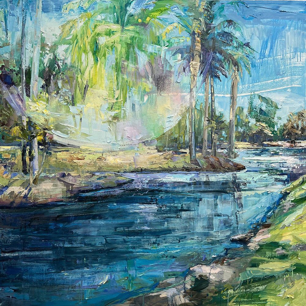 Using both real and imagined places for her inspiration, Julie Himel creates pathways and landscapes that invite the viewer to step into her dreamlike environments. She creates richly textured surfaces by using bold, active brushstrokes and unorthodox, yet highly saturated colors. Using paint as the medium to formalize the possibility of a place, Himel’s Awe Struck series reflects a call for symbiosis with the natural world around us.